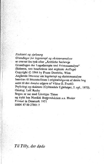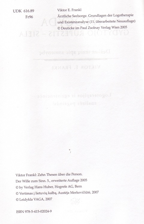 | Ärztliche Seelsorge. Grundlagen der Logotherapie und Existenzanalyse. ----- Psykiatern och själen. Logoterapins och existensanalysens grunder. |
