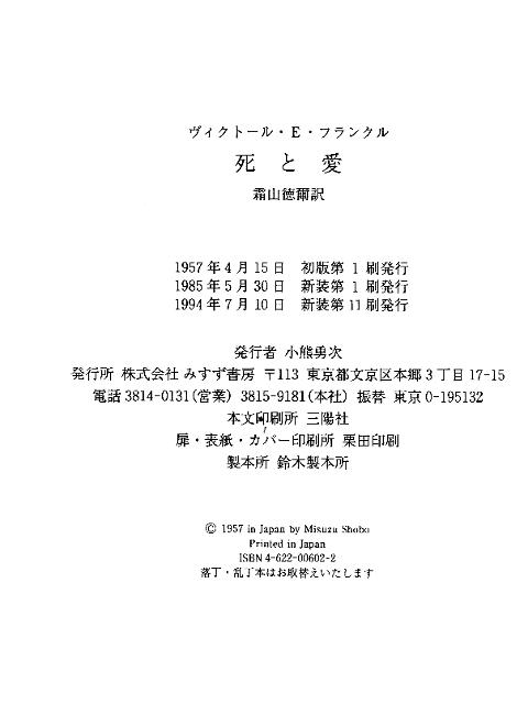 | Misuzu Shobo, Tokyo 1957-19xx, Shi to ai. Zitsuzonbunseki nyumon. ("Tod und Liebe"); ISBN 4-622-00602-2 |