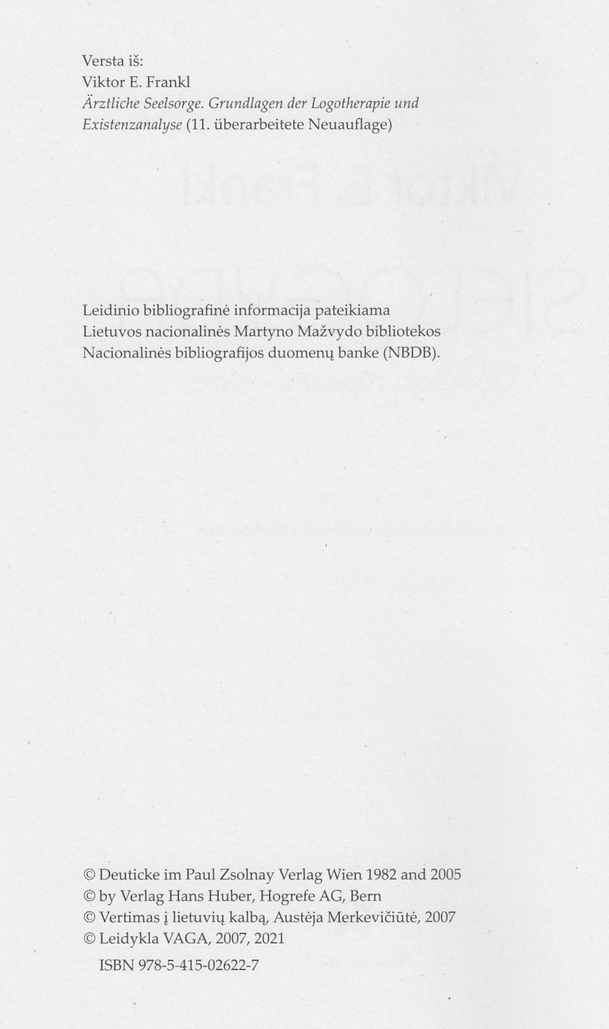 | Ärztliche Seelsorge (Franz Deuticke, Wien 1982, 10. Auflage). ----- Liječnik i dusa. |