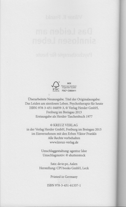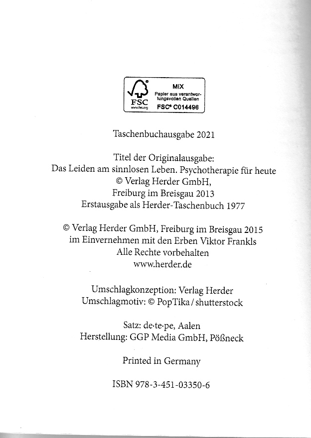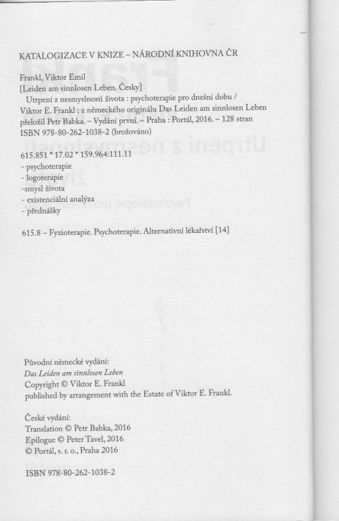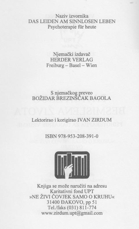 | Das Leiden am sinnlosen Leben. Psychotherapie fuer heute (Herder, Freiburg-Basel-Wien 1989). ----- Patnja zbog besmislena zivota. Psihoterapija za danasnje vrijeme. |