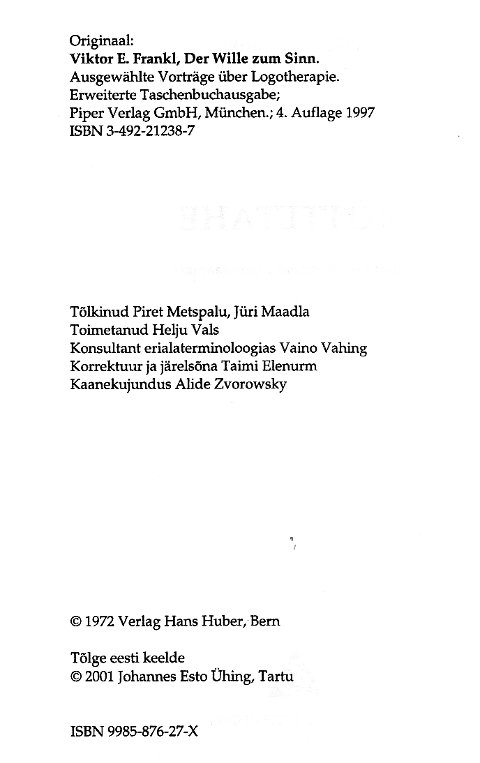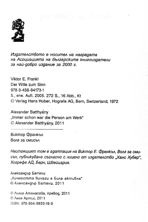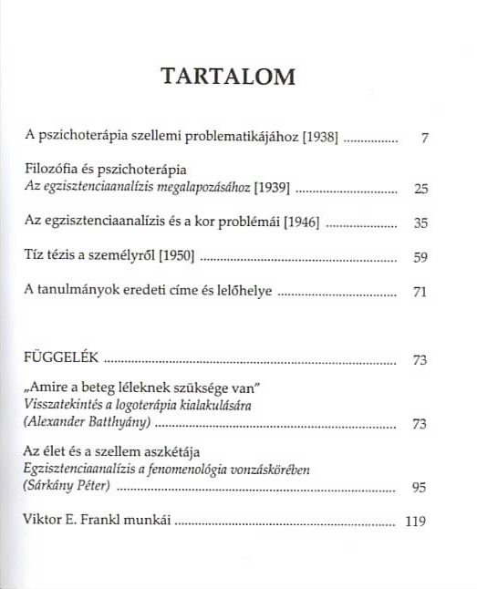Auszüge aus: "Der Wille zum Sinn" und "Logotherapie und Existenzanalyse". Ü: Huba Csiki und Péter Sárkány. Hrsg.: Péter Sárkány, Alexander Batthyány. |