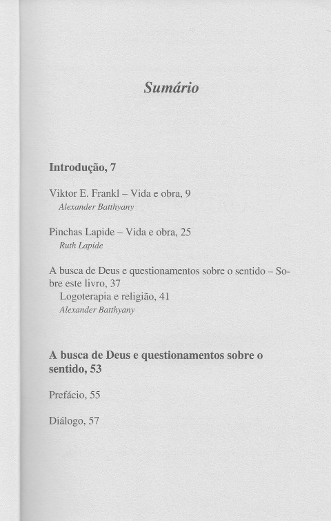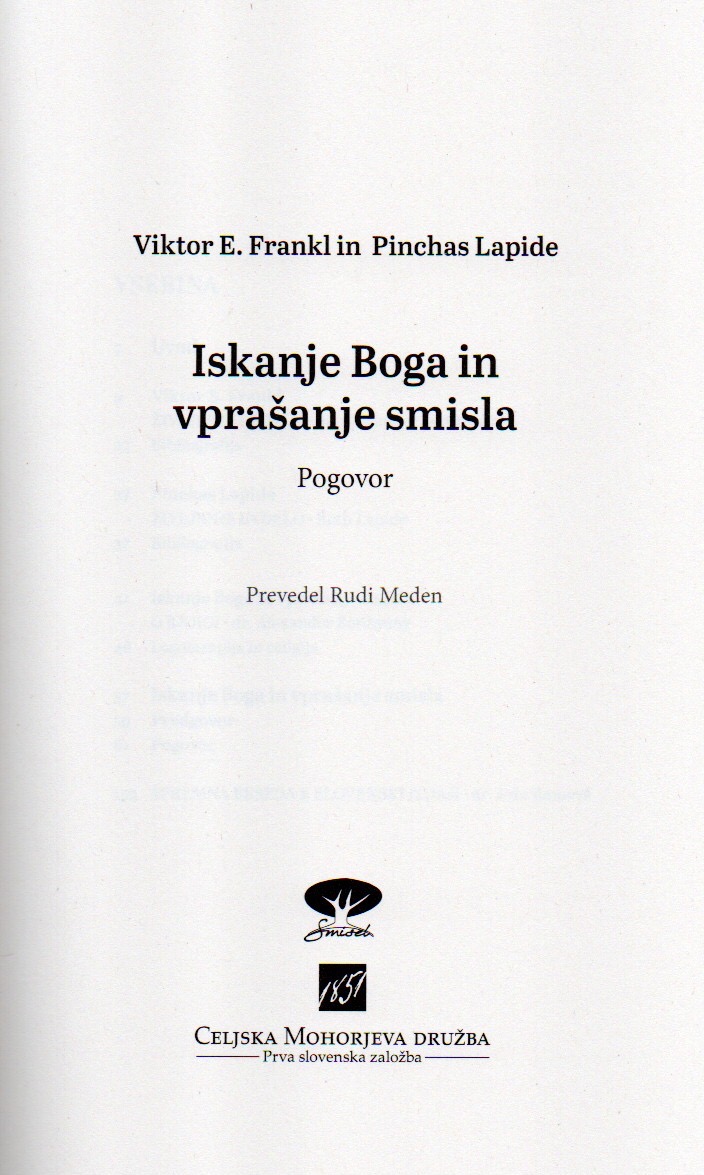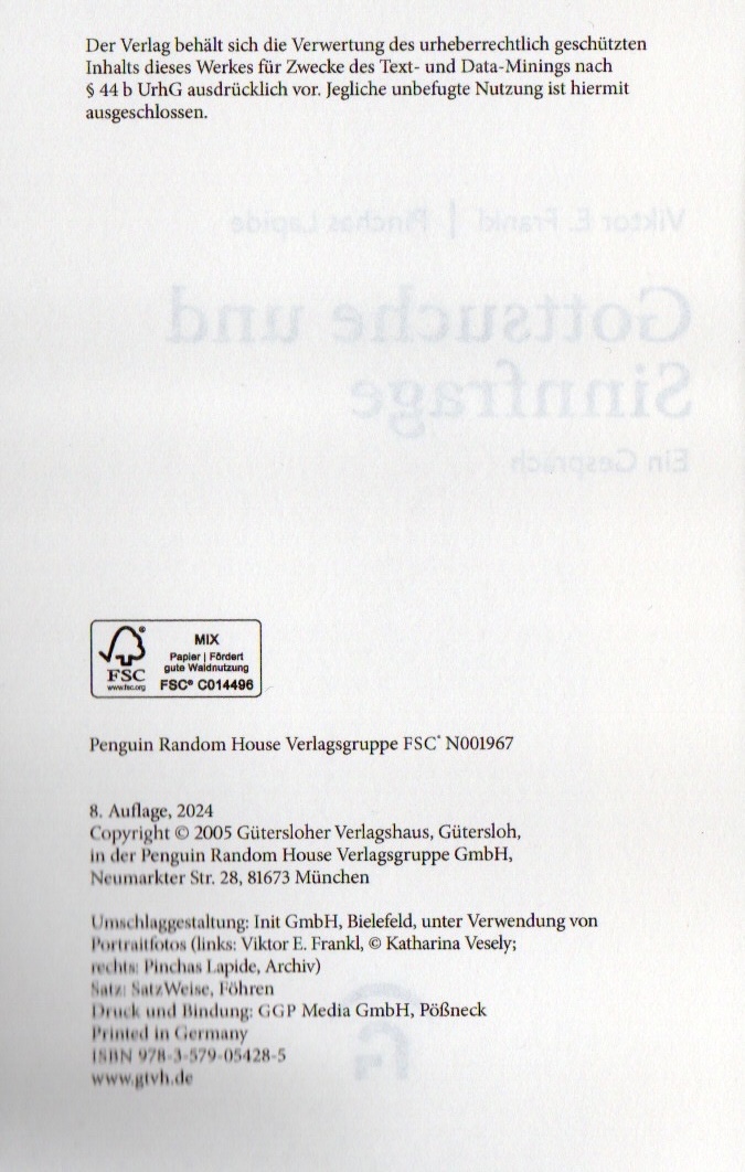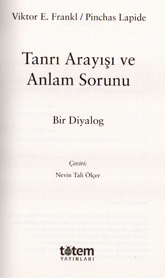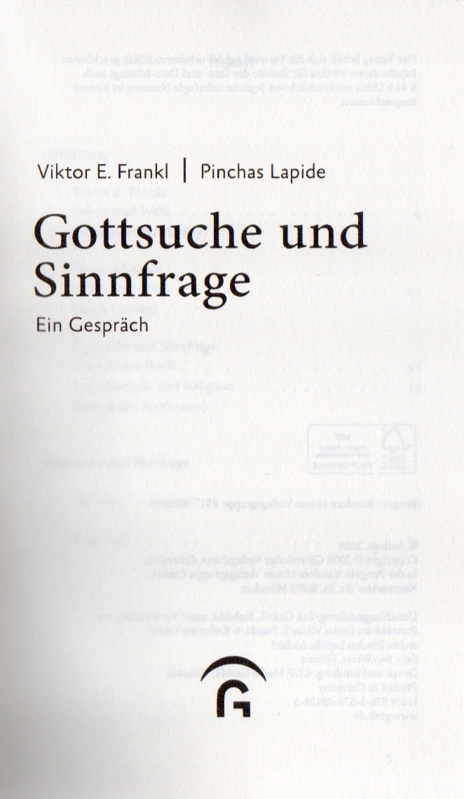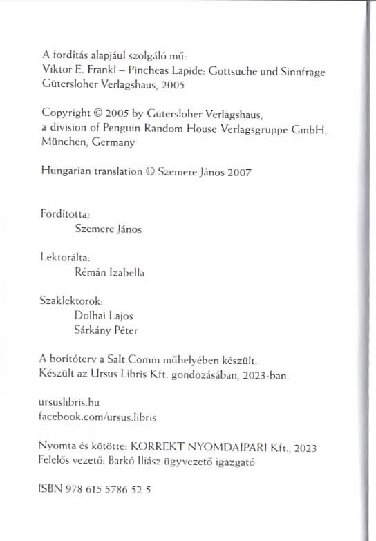 Frankl, Viktor E., und Pinchas Lapide; Mit einem Anhang von Alexander Batthyány, Ruth Lapide und Péter Sárkány. Ü János Szemere. Reihe Sinnvolles Leben / Értelmes élet sorozat, JEL Verlag; Hrsg. Alexander Batthyány & Péter Sárkány, ISNN 1786-1624 |