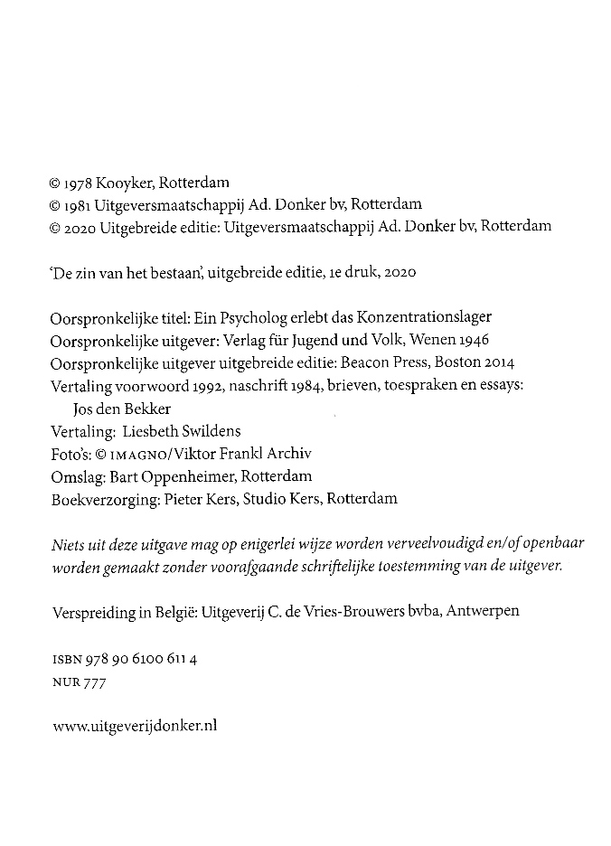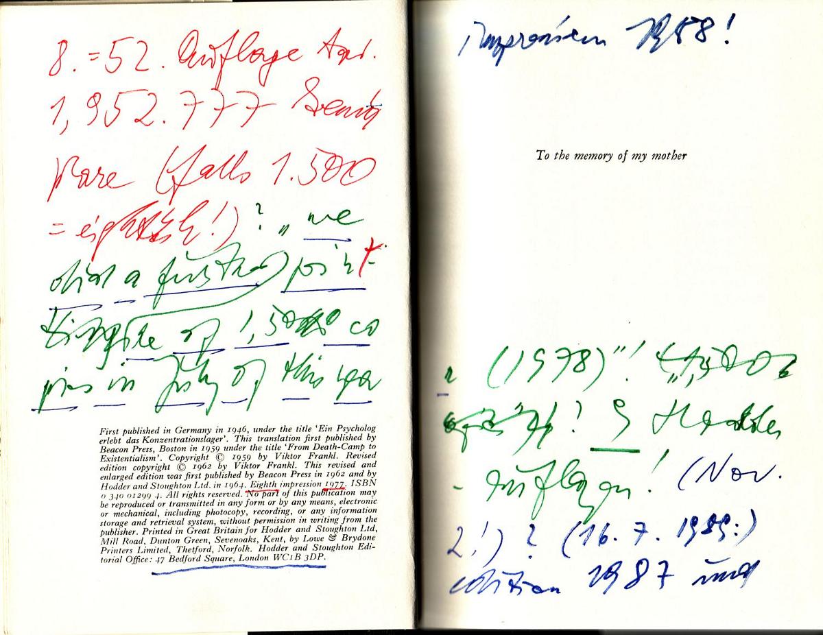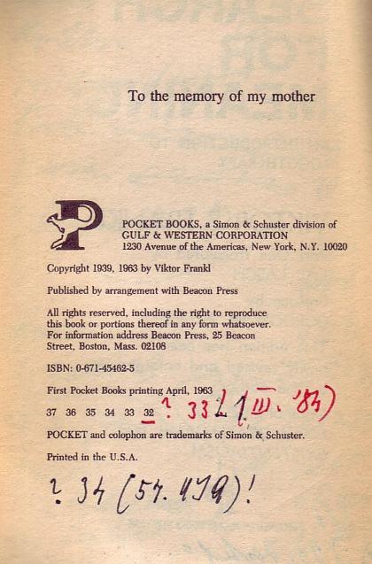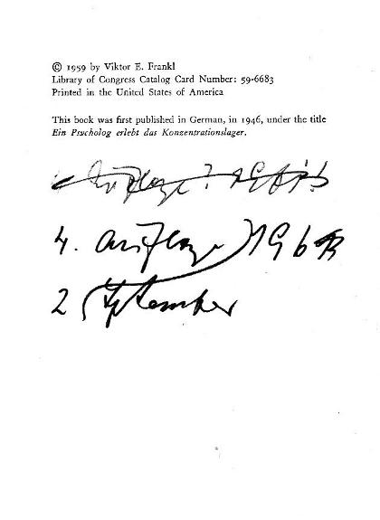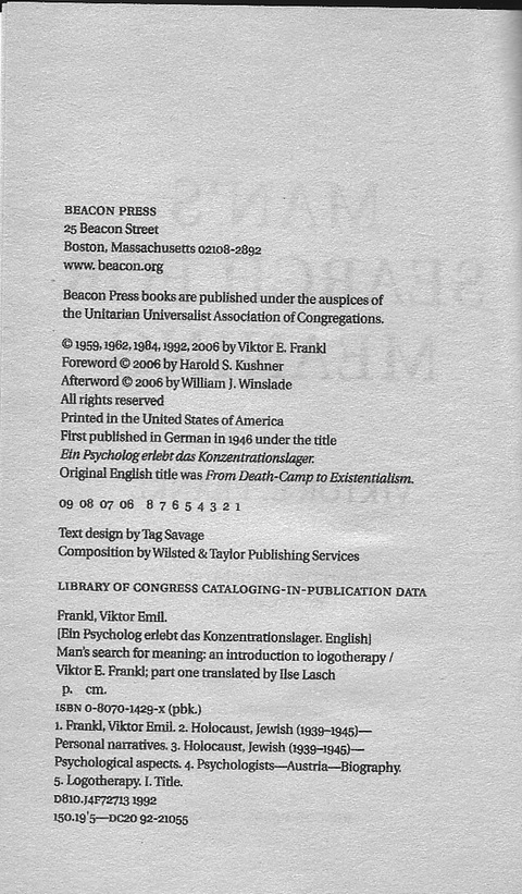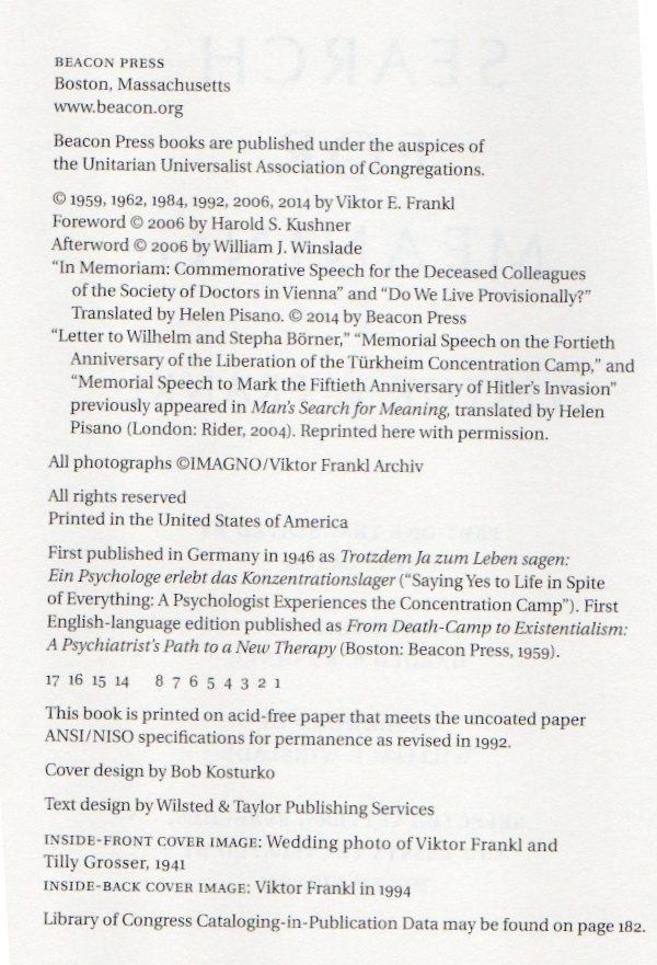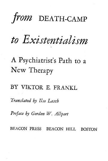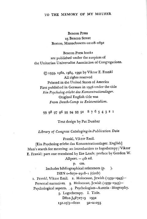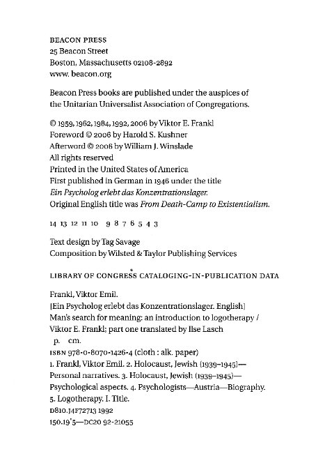 Übersetzung: Ilse Lasch. Preface by Gordon W. Allport. / (A revised edition of From Death-Camp to Existentialism). Beacon 2006: New Foreword by Harold S. Kushner. |