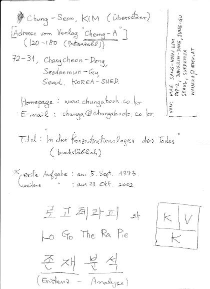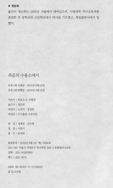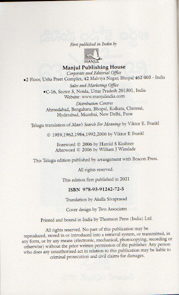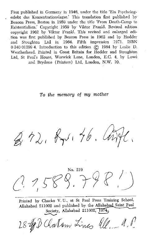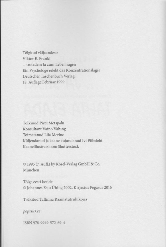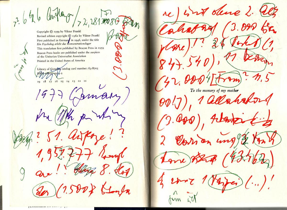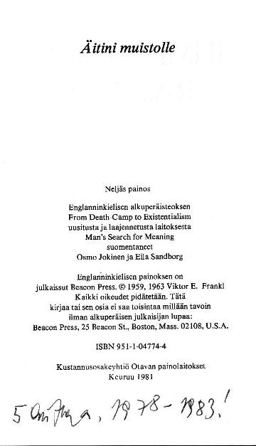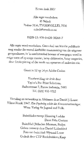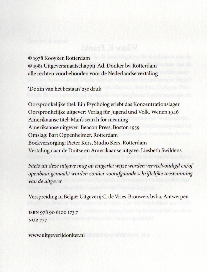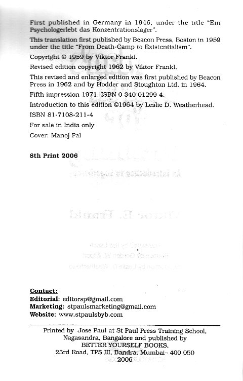 Übersetzung: Ilse Lasch. Preface by Gordon W. Allport. / (A revised edition of From Death-Camp to Existentialism). Beacon 2006: New Foreword by Harold S. Kushner. |