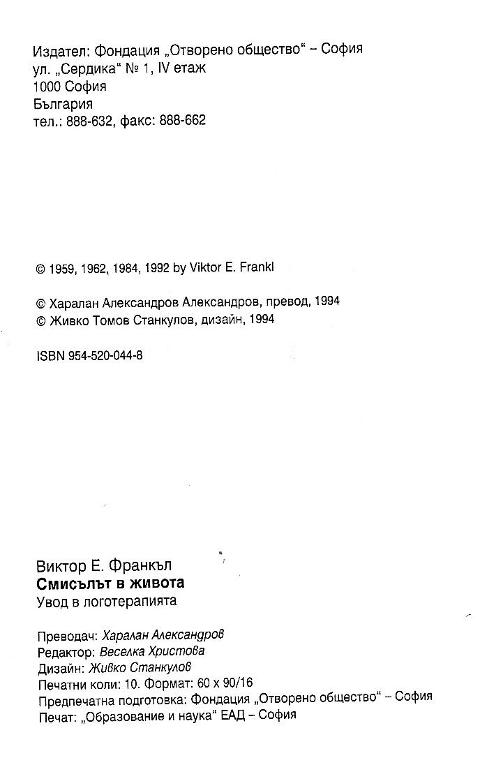 | Smysl v shivota. Uvod v logoterapiata, Open Society, Sofia 1994 (ISBN 954-520-044-8) |
