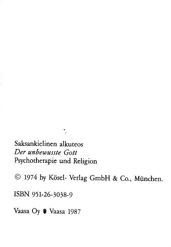 | Der unbewusste Gott. ----- Tiedostamaton jumala. Psykoterapian ja uskonnon suhteesta. |