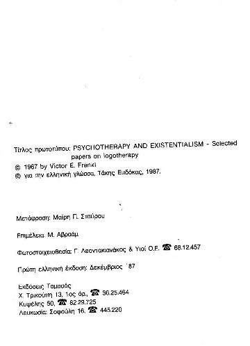 mit Ol. Reiser, G. Leytham und R.Lofgren: Synthesis as the function of philosophy"; Beitrag zu einem Sammelwerk "... Reiser - G. Leytham - V. Frankl - R. Lofgren" (herausgegeben von Triantafyllou, Ph. D., The Upper Devision of Pierce College, 8, Kodrou Street, Athens 119, Greece), Verlag Nikh, Athen 1964 (griechische Übersetzung von "Basic Concepts of Logotherapy") |