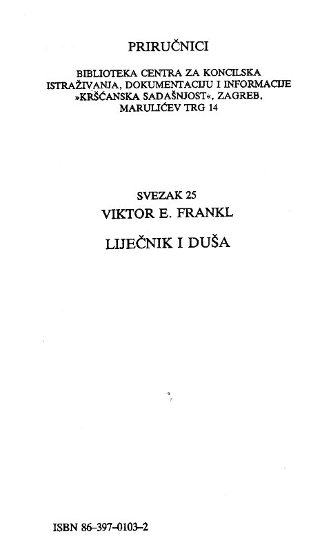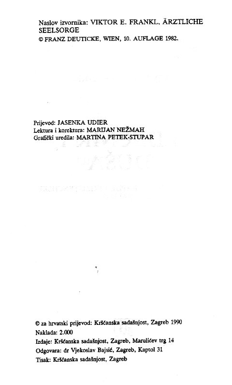 | Ärztliche Seelsorge (Franz Deuticke, Wien 1982, 10. Auflage). ----- Liječnik i dusa. |